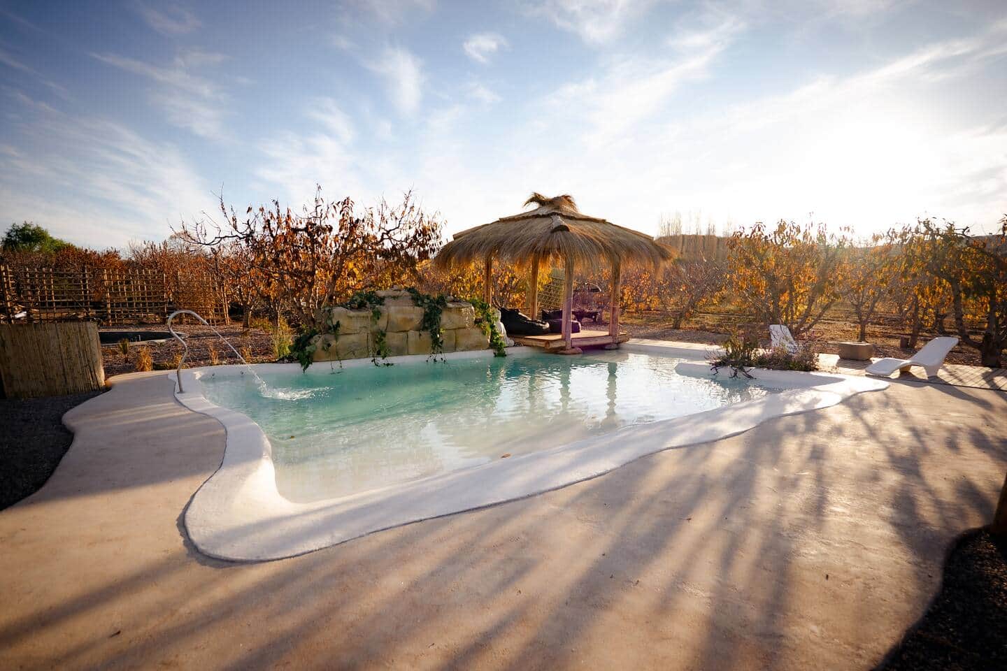 Bali Andino Lodge es una experiencia única en la ruta del vino. Cada lodge es privado, con patio, terraza con vistas a la cordillera, fogonero y decoración artesanal con materiales nobles. Ubicado en una finca de cerezos en Vistalba, permite recorrer las mejores bodegas en bicicleta. Con pileta tipo playa y un entorno natural incomparable, es el lugar perfecto para una escapada romántica o de descanso. Si te gusta el vino y las experiencias increíbles, te esperamos en Bali Andino.